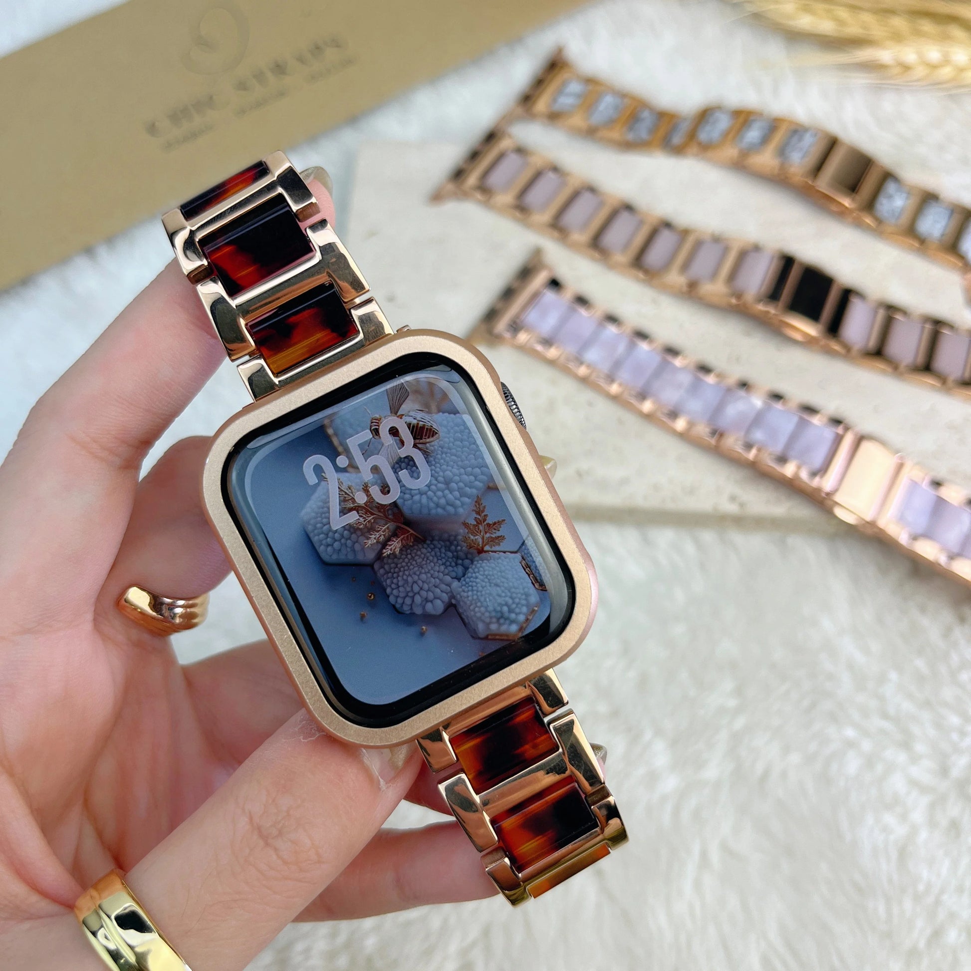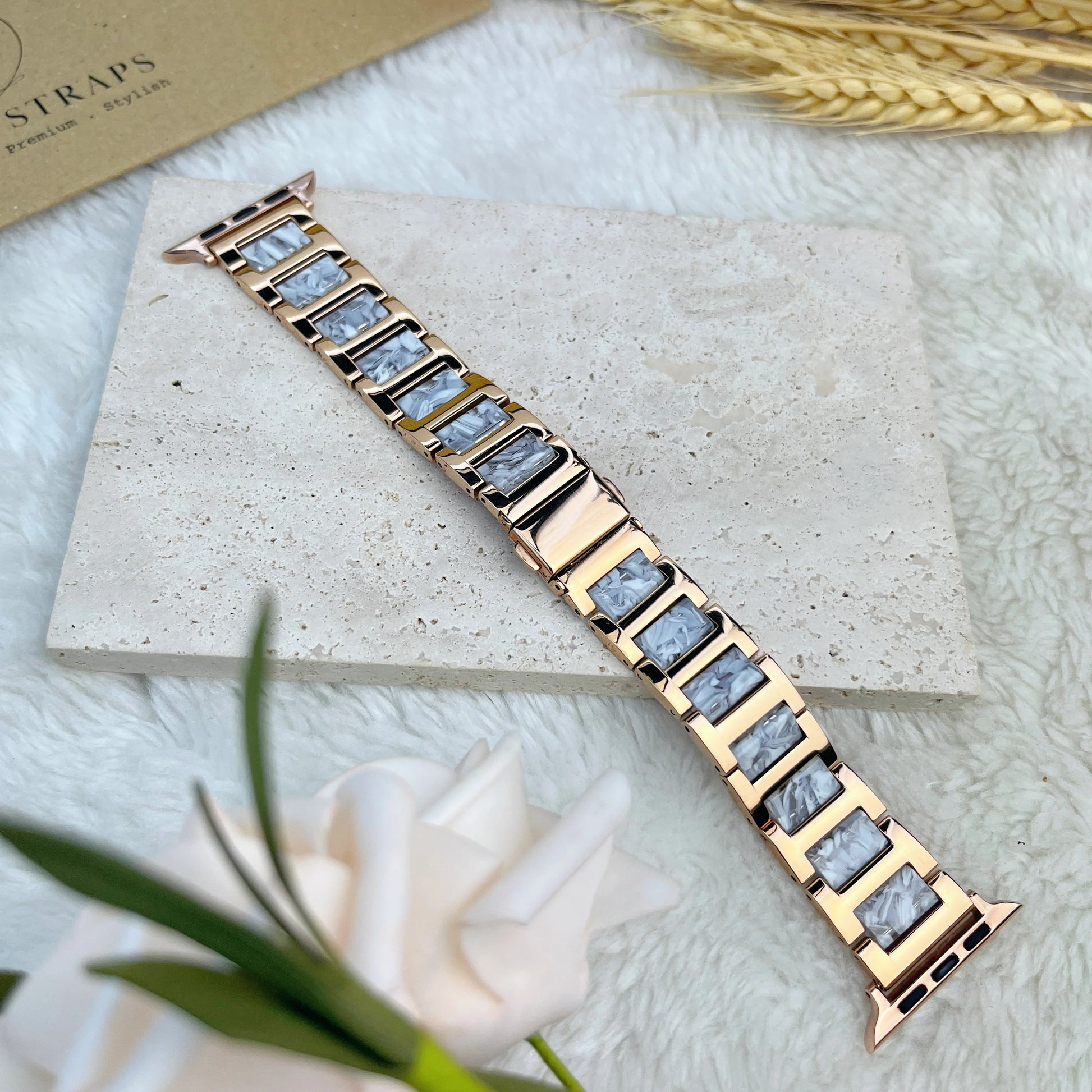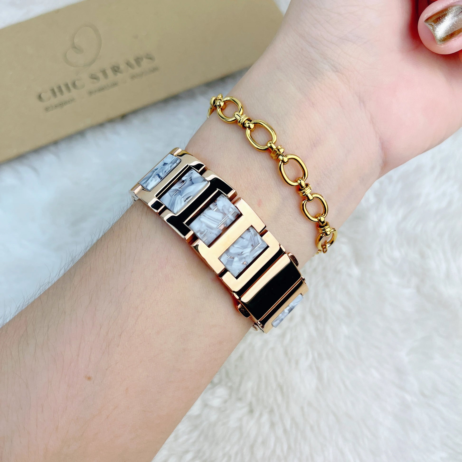 Elevate your Apple Watch with the Cerla Link, a refined statement piece designed for timeless sophistication. Each link is crafted with glossy hardware paired with delicate resin inlays, giving it a soft, luxurious sheen that instantly elevates any look — from daily chic to evening glam.